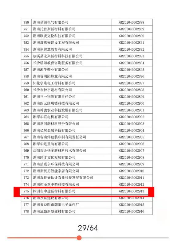 近日,根據全國高新技術企業認定管理工作領導小組公示的《關于湖南省2020年第二批高新技術企業備案的復函》(國科火字〔2020〕253號),湖南省2020年第二批高新技術企業名單出爐,株洲市中建新材料有限公司獲得認定。證書編號:GR202043002913。